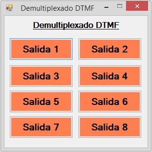 using System; using System.Collections.Generic; using System.ComponentModel; using System.Data; using System.Drawing; using System.Text; using System.Windows.Forms; using System.Media; namespace Demultiplexor_DTMF_01 { public partial class Form1 : Form { public Form1() { InitializeComponent(); } SoundPlayer dtmf; private void button1_Click(object sender, EventArgs e) { dtmf = new SoundPlayer("DTMF_D.wav"); dtmf.Play(); } private void button2_Click(object sender, EventArgs e) { dtmf = new SoundPlayer("DTMF_1.wav"); dtmf.Play(); } private void button3_Click(object sender, EventArgs e) { dtmf = new SoundPlayer("DTMF_2.wav"); dtmf.Play(); } private void button4_Click(object sender, EventArgs e) { dtmf = new SoundPlayer("DTMF_3.wav"); dtmf.Play(); } private void button5_Click(object sender, EventArgs e) { dtmf = new SoundPlayer("DTMF_4.wav"); dtmf.Play(); } private void button6_Click(object sender, EventArgs e) { dtmf = new SoundPlayer("DTMF_5.wav"); dtmf.Play(); } private void button7_Click(object sender, EventArgs e) { dtmf = new SoundPlayer("DTMF_6.wav"); dtmf.Play(); } private void button8_Click(object sender, EventArgs e) { dtmf = new SoundPlayer("DTMF_7.wav"); dtmf.Play(); } } }