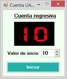 using System; using System.Collections.Generic; using System.ComponentModel; using System.Data; using System.Drawing; using System.Text; using System.Windows.Forms; using System.Media; namespace Cuenta_regresiva_UART_01 { public partial class Form1 : Form { public Form1() { InitializeComponent(); } byte[] buffer = { 1 }; SoundPlayer tic; byte cnt = 10; int displays; int unidad, decena; private void Form1_Load(object sender, EventArgs e) { serialPort1.Open(); serialPort1.Write(buffer, 0, 1); } private void btnIniciar_Click(object sender, EventArgs e) { cnt = (byte)nudInicio.Value; tic = new SoundPlayer("tic-tac_loop.wav"); tic.PlayLooping(); timer1.Enabled = true; nudInicio.Enabled = false; btnIniciar.Enabled = false; } private void timer1_Tick(object sender, EventArgs e) { lblNumero.Text = cnt.ToString("D2"); unidad = cnt % 10; decena = cnt / 10; displays = unidad << 4; displays = displays + decena; if (cnt == 0) { tic.Stop(); timer1.Enabled = false; tic = new SoundPlayer("tic-tac_end.wav"); tic.Play(); nudInicio.Enabled = true; btnIniciar.Enabled = true; } else cnt--; buffer[0] = (byte)displays; serialPort1.Write(buffer, 0, 1); } private void nudInicio_ValueChanged(object sender, EventArgs e) { cnt = (byte)nudInicio.Value; lblNumero.Text = cnt.ToString("D2"); unidad = cnt % 10; decena = cnt / 10; displays = unidad << 4; displays = displays + decena; buffer[0] = (byte)displays; serialPort1.Write(buffer, 0, 1); } private void Form1_FormClosing(object sender, FormClosingEventArgs e) { buffer[0] = 255; serialPort1.Write(buffer, 0, 1); serialPort1.Close(); } } }