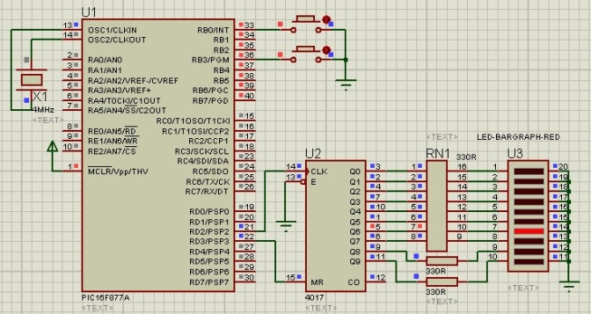 short cnt = 0; short i; void main() { OPTION_REG.F7 = 0; //Activa los pull-up TRISD = 0xF3; //Asigancion del puerto PORTD = 0; //inicia en 0 el puerto D while(1) { //bucle infinito if(PORTB.F3 == 0 && cnt > 0){ //decrementar cnt--; PORTD.F3 = 1; PORTD.F3 = 0; for(i = 0; i < cnt; i++){ PORTD.F2 = 1; PORTD.F2 = 0; } while(PORTB.F3 == 0); } if(PORTB.F0 == 0 && cnt < 9){ //incrementar cnt++; PORTD.F2 = 1; PORTD.F2 = 0; while(PORTB.F0 == 0); } } }