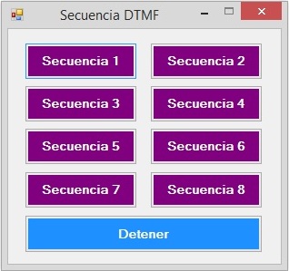 using System; using System.Collections.Generic; using System.ComponentModel; using System.Data; using System.Drawing; using System.Text; using System.Windows.Forms; using System.Media; namespace Demultiplexor_DTMF_02 { public partial class Form1 : Form { public Form1() { InitializeComponent(); } SoundPlayer dtmf; private void button1_Click(object sender, EventArgs e) { dtmf = new SoundPlayer("Secuencia_01.wav"); dtmf.PlayLooping(); } private void button2_Click(object sender, EventArgs e) { dtmf = new SoundPlayer("Secuencia_02.wav"); dtmf.PlayLooping(); } private void button3_Click(object sender, EventArgs e) { dtmf = new SoundPlayer("Secuencia_03.wav"); dtmf.PlayLooping(); } private void button4_Click(object sender, EventArgs e) { dtmf = new SoundPlayer("Secuencia_04.wav"); dtmf.PlayLooping(); } private void button5_Click(object sender, EventArgs e) { dtmf = new SoundPlayer("Secuencia_05.wav"); dtmf.PlayLooping(); } private void button6_Click(object sender, EventArgs e) { dtmf = new SoundPlayer("Secuencia_06.wav"); dtmf.PlayLooping(); } private void button7_Click(object sender, EventArgs e) { dtmf = new SoundPlayer("Secuencia_07.wav"); dtmf.PlayLooping(); } private void button8_Click(object sender, EventArgs e) { dtmf = new SoundPlayer("Secuencia_08.wav"); dtmf.PlayLooping(); } private void btnDetener_Click(object sender, EventArgs e) { dtmf.Stop(); } } }