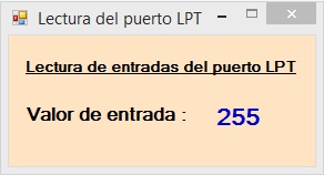 using System; using System.Collections.Generic; using System.ComponentModel; using System.Data; using System.Drawing; using System.Text; using System.Windows.Forms; using System.Runtime.InteropServices; namespace Entradas_LPT_01 { public partial class Form1 : Form { class ControlPort { [DllImport("inpout32.dll", EntryPoint = "Inp32")] public static extern char Input(int adress); } public Form1() { InitializeComponent(); } private void timer1_Tick(object sender, EventArgs e) { int puerto = ControlPort.Input(0x379); lblEntrada.Text = puerto.ToString(); } } }