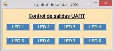 using System; using System.Collections.Generic; using System.ComponentModel; using System.Data; using System.Drawing; using System.Text; using System.Windows.Forms; namespace Control_de_salidas_UART_01 { public partial class Form1 : Form { public Form1() { InitializeComponent(); } byte[] buffer = { 0 }; byte valor = 0; private void Form1_Load(object sender, EventArgs e) { serialPort1.Open(); serialPort1.Write(buffer, 0, 1); } private void button1_Click(object sender, EventArgs e) { if (button1.BackColor == Color.SteelBlue) { valor += 1; button1.BackColor = Color.Crimson; } else { valor -= 1; button1.BackColor = Color.SteelBlue; } buffer[0] = valor; serialPort1.Write(buffer, 0, 1); } private void button2_Click(object sender, EventArgs e) { if (button2.BackColor == Color.SteelBlue) { valor += 2; button2.BackColor = Color.Crimson; } else { valor -= 2; button2.BackColor = Color.SteelBlue; } buffer[0] = valor; serialPort1.Write(buffer, 0, 1); } private void button3_Click(object sender, EventArgs e) { if (button3.BackColor == Color.SteelBlue) { valor += 4; button3.BackColor = Color.Crimson; } else { valor -= 4; button3.BackColor = Color.SteelBlue; } buffer[0] = valor; serialPort1.Write(buffer, 0, 1); } private void button4_Click(object sender, EventArgs e) { if (button4.BackColor == Color.SteelBlue) { valor += 8; button4.BackColor = Color.Crimson; } else { valor -= 8; button4.BackColor = Color.SteelBlue; } buffer[0] = valor; serialPort1.Write(buffer, 0, 1); } private void button5_Click(object sender, EventArgs e) { if (button5.BackColor == Color.SteelBlue) { valor += 16; button5.BackColor = Color.Crimson; } else { valor -= 16; button5.BackColor = Color.SteelBlue; } buffer[0] = valor; serialPort1.Write(buffer, 0, 1); } private void button6_Click(object sender, EventArgs e) { if (button6.BackColor == Color.SteelBlue) { valor += 32; button6.BackColor = Color.Crimson; } else { valor -= 32; button6.BackColor = Color.SteelBlue; } buffer[0] = valor; serialPort1.Write(buffer, 0, 1); } private void button7_Click(object sender, EventArgs e) { if (button7.BackColor == Color.SteelBlue) { valor += 64; button7.BackColor = Color.Crimson; } else { valor -= 64; button7.BackColor = Color.SteelBlue; } buffer[0] = valor; serialPort1.Write(buffer, 0, 1); } private void button8_Click(object sender, EventArgs e) { if (button8.BackColor == Color.SteelBlue) { valor += 128; button8.BackColor = Color.Crimson; } else { valor -= 128; button8.BackColor = Color.SteelBlue; } buffer[0] = valor; serialPort1.Write(buffer, 0, 1); } private void Form1_FormClosing(object sender, FormClosingEventArgs e) { buffer[0] = 0; serialPort1.Write(buffer, 0, 1); serialPort1.Close(); } } }