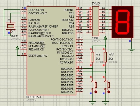 const unsigned short digitos[] = { 0x3F, 0x06, 0x5B, 0x4F, 0x66, 0x6D, 0x7D, 0x07, 0x7F, 0x6F, }; void main(void) { unsigned short contador = 0; TRISB = 128; TRISD = 255; PORTB = 0x3F; while( 1 ){ if (PORTD.F1 == 0){ if (contador < 9) contador++; while(PORTD.F1 == 0) PORTB = digitos[contador]; } if (PORTD.F0 == 0){ if (contador > 0) contador--; while(PORTD.F0 == 0) PORTB = digitos[contador]; } } }