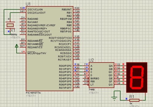 short cnt = 0; //variable de conteo en cero void main() { TRISD = 0xF0; //Asigancion del puerto PORTD = 0; //valor de inicio while(1) { //bucle infinito if (cnt == 10) //condicion de reinicio cnt = 0; //reinicio del contador PORTD = cnt; //salida del contador por el puerto D Delay_ms(1000); //retardo de 1 segundo cnt++; //incremento del contador } }