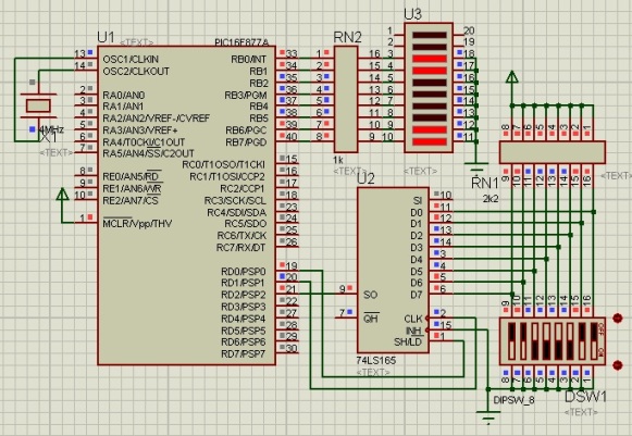 unsigned short dato, i; //declaracion de variables void main() { TRISD = 0xFC; //Asigna 2 bits de salida TRISB = 0; //asigna al puerto B como salida PORTD = 0x01; //inicializa el valor del puerto D a 1 dato = 0; //inicializa el valor de dato a 0 while(1) { //bucle infinito PORTD.F0 = 0; //Carga los datos del 74165 PORTD.F0 = 1; //pone en alto el bit de load if (PORTD.F2 == 1) //pregunta si el bit 3 esta en alto dato = 1 | (dato << 1); else dato = 0 | (dato << 1); for(i = 1; i < 8; i++){ //ciclo para leer los 7 bits restantes PORTD.F1 = 1; //pone en alto el bit de clock PORTD.F1 = 0; //pone en bajo el bit de clock if (PORTD.F2 == 1) //pregunta si el bit 3 esta en alto dato = 1 | (dato << 1); else dato = 0 | (dato << 1); } PORTB = dato; //imprime por el puerto B el avalor de dato Delay_ms(1); //pausa de 1 milisegundo dato = 0; //reinicia el vaor de la variable dato } }