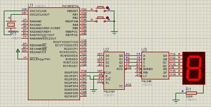 unsigned short cnt = 0; //declaracion de variables void main() { OPTION_REG.F7 = 0; //habilita los pullup TRISD = 0xFC; //Asigna 2 bits de salida PORTD = 1; //inicializa el valor del puerto D a 1 while(1) { //bucle infinito if (PORTB.F3 == 0 && cnt < 9){ //condicion de incremento cnt++; //incrementa el valor del contador PORTD.F1 = 0; //pone en bajo el bit de incremento PORTD.F0 = 0; //cambio de estado para el reloj PORTD.F0 = 1; while (PORTB.F3 == 0); } if (PORTB.F0 == 0 && cnt > 0){ //condicion de decremento cnt--; //decrementa el valor del contador PORTD.F1 = 1; //pone en alto el bit de decremento PORTD.F0 = 0; //cambio de estado para el reloj PORTD.F0 = 1; while (PORTB.F0 == 0); } } }