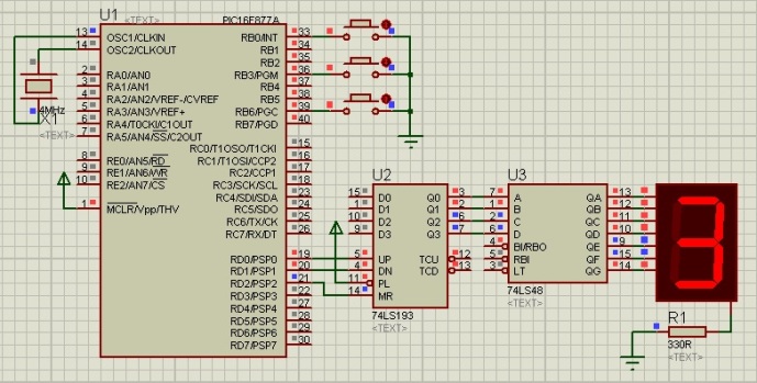 unsigned short cnt = 0; //declaracion de variables void main() { OPTION_REG.F7 = 0; //habilita los pullup TRISD = 0xF8; //Asigna 3 bits de salida PORTD = 3; //inicializa el valor del puerto D a 3 while(1) { //bucle infinito if (PORTB.F6 == 0 && cnt < 9){ //condicion de incremento cnt++; //incrementa el valor del contador PORTD.F0 = 0; //cambio de estado para el reloj ascendente PORTD.F0 = 1; while (PORTB.F6 == 0); } if (PORTB.F0 == 0 && cnt > 0){ //condicion de decremento cnt--; //decrementa el valor del contador PORTD.F1 = 0; //cambio de estado para el reloj descendente PORTD.F1 = 1; while (PORTB.F0 == 0); } if (PORTB.F3 == 0){ //condicion de reinicio de conteo cnt = 0; //reinicia el valor del contador PORTD.F2 = 1; //cambio de estado para el reset PORTD.F2 = 0; while (PORTB.F3 == 0); } } }