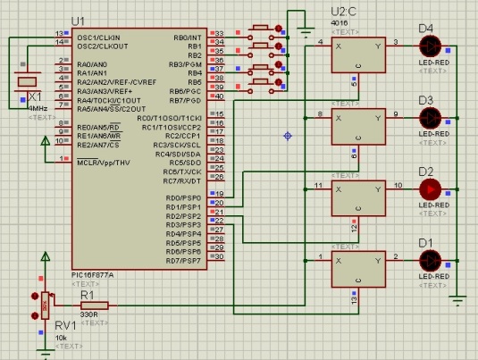 void main() { OPTION_REG.F7 = 0; //Activa los pull-up TRISD = 0xF0; //Asigancion del puerto PORTD = 8; //inicia en 0 el puerto D while(1) { //bucle infinito if(PORTB.F0 == 0) //si boton es presionado PORTD = 8; //activa el switch 1 if(PORTB.F2 == 0) PORTD = 4; //activa el switch 2 if(PORTB.F4 == 0) PORTD = 2; //activa el switch 3 if(PORTB.F6 == 0) PORTD = 1; //activa el switch 4 } }