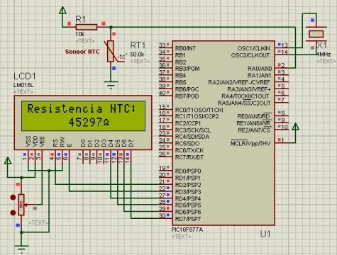 //Pines de salida para el LCD sbit LCD_RS at RD2_bit; sbit LCD_EN at RD3_bit; sbit LCD_D7 at RD7_bit; sbit LCD_D6 at RD6_bit; sbit LCD_D5 at RD5_bit; sbit LCD_D4 at RD4_bit; //Bits de configuración TRIS sbit LCD_RS_Direction at TRISD2_bit; sbit LCD_EN_Direction at TRISD3_bit; sbit LCD_D7_Direction at TRISD7_bit; sbit LCD_D6_Direction at TRISD6_bit; sbit LCD_D5_Direction at TRISD5_bit; sbit LCD_D4_Direction at TRISD4_bit; void main() { long Rntc; //Declaración de variables. unsigned int Radc; char Text[12]; ADCON0.ADON = 1; // A/D converter module is powered up ADCON1 = 0x8E; //configura AN0 como analogico Lcd_Init(); //Inicialización del LCD. Lcd_Cmd(_LCD_CURSOR_OFF); //Se apaga el cursor. Lcd_Out(1, 1,"Resistencia NTC:"); //Se imprime texto. while(1){ //Bucle infinito. Radc=ADC_Read(0); //Lectura del canal análogo. Rntc = (Radc * 48.87585533) / (5.0 - Radc * 0.004887585); //Implementación del cálculo de la NTC LongToStr( Rntc, Text ); //Se convierte el valor entero largo, en cadena de texto. Lcd_Out( 2, 1, Text ); //Se imprime la lectura del sensor. Lcd_chr_cp(0xF4); //simbolo de ohmm delay_ms(1000); //Retardo de 1000m segundos. } }